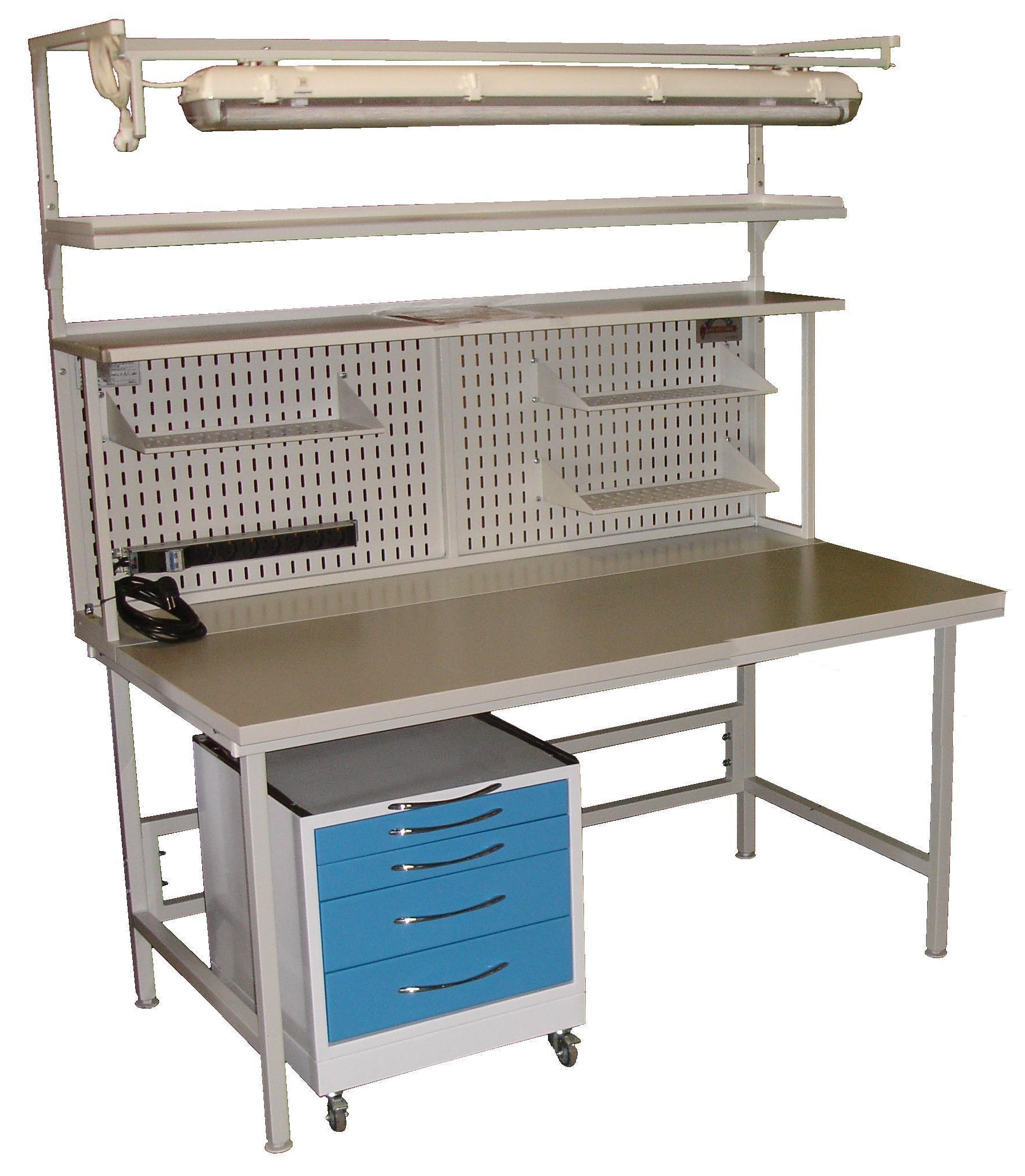 Базовая модель представляет собой металлический каркас из профильной трубы 30х30х1,5 на регулируемых опорах для компенсации неровностей пола, подкатной тумбой с четырмя выдвижными ящиками на телескопических направляющих, блоком из семи розеток на 220 В и светодиодным светильником. Порошковая окраска.